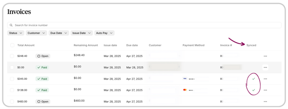 If you have an ERP or accounting software integrated with Notch, you can check the invoice sync status from the "Invoices" page. If the payment status has been successfully synced to your connected accounting software, you’ll see a check mark ✓ next to the invoice under the "Synced" column, indicating that it has been successfully synced to your ERP or accounting software. This helps identify the invoice sync status for easier reconciliation.