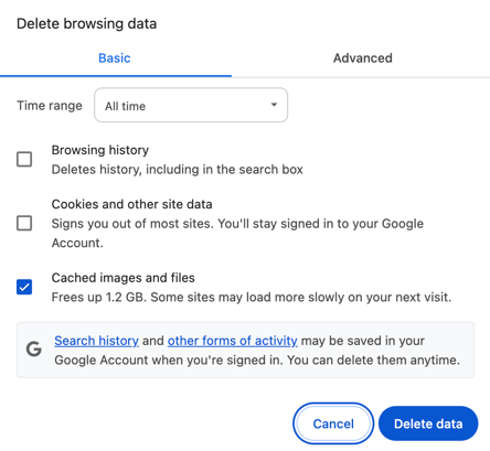 - Select the types of information you want to delete (we suggest to only check off "Cached images and files" so your other data will still be in tact).